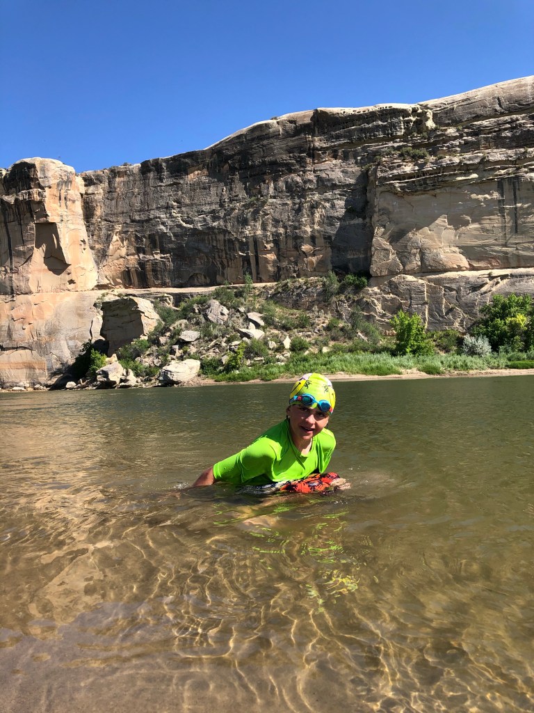 We headed northwest to Dinosaur National Monument. It was HOT and if we were to visit again it would have to be a season other than summer. We hiked 4-6 miles each day through canyons and up scrambling rocks. We cooled off in the afternoons with a dip in the Green River where tiny, curious fish would nibble our toes. By now we’ve found a comfortable camping and cooking rhythm. There’s coyote howling in the distance through the night and the almost full moon comes up really late in the so we can go to sleep with the windows open and blankets off. Our next stop will be somewhere about halfway between here and Yellowstone for rest and supplies.