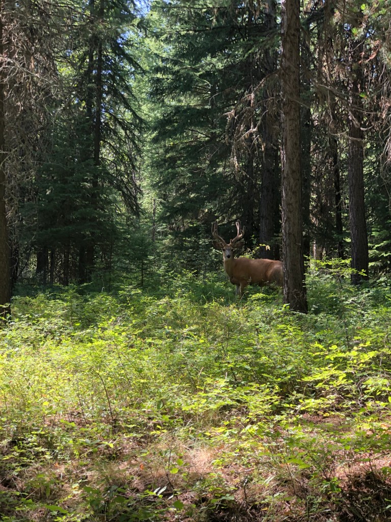 Our final wildlife encounter for the day was a buck mule dear encroaching on our camping spot for the fresh greenery. We watched him for well over an hour taking a nap nearby then continually approaching the greens at the edge of our site. He made our camp rest time peaceful and interesting. It was finally a cool enough day for another fire so the day ended late with a big pasta dinner topped with s’mores.
