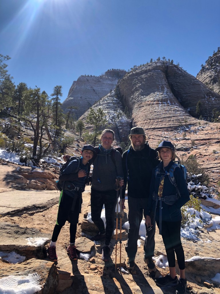 The next day we were back to our exploring selves, this time driving to the northwest side of Zion and hiking in the wilderness area. There was a lot of snow still on the ground from the system that had hit us in Bryce, so our 4 mile hike was a wet and muddy one but still lots of fun. The view at the end was the most rewarding. And seeing only a handful of people on the trail was even better vs. the busy main part of the park we had explored the other day. We only spent two days in Zion but we felt like that was a good taste of the area. Perhaps we’ll return here for some more technical activity after winter, there’s lots more to explore but it was once again time to move on to warmer climes.